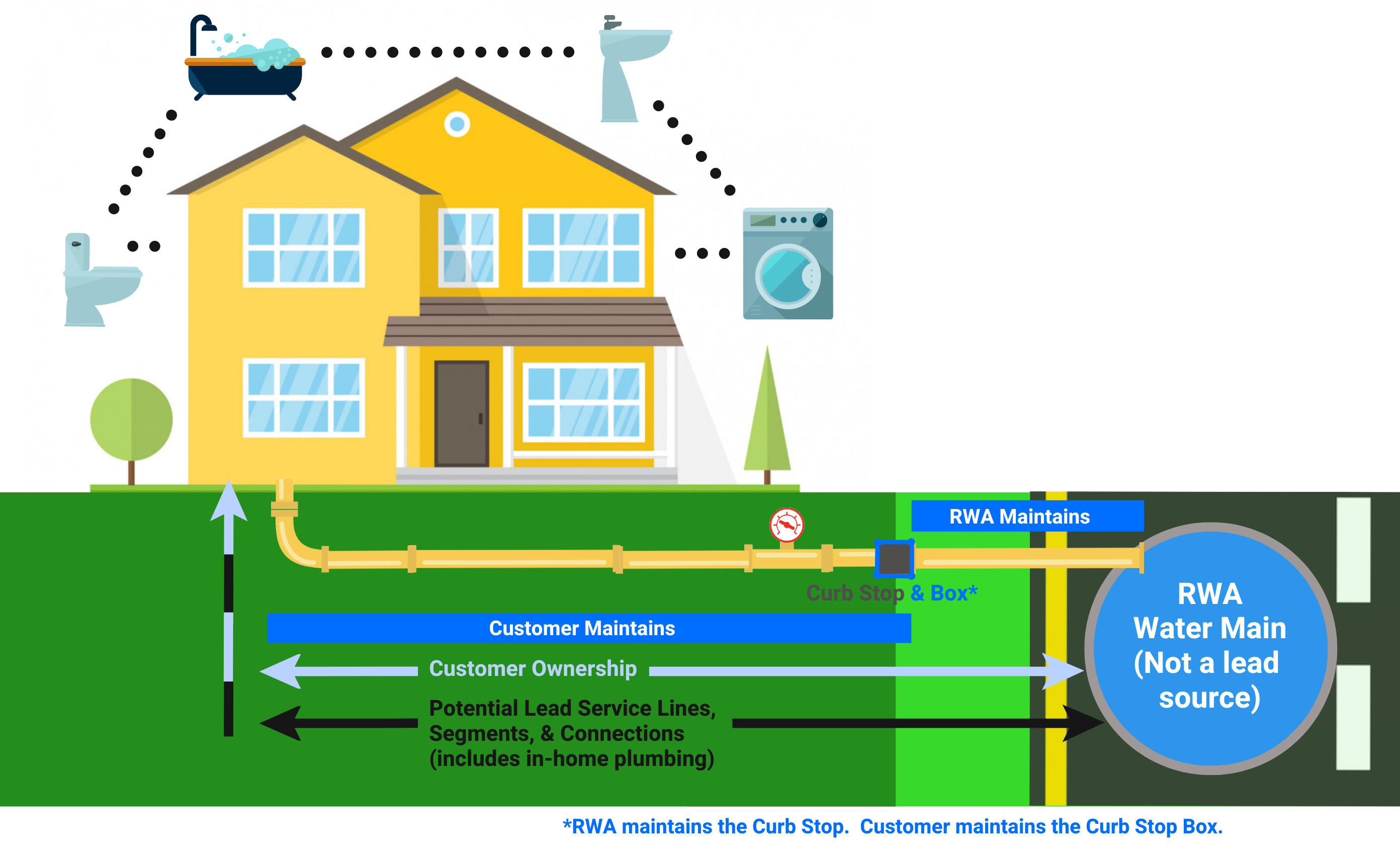 A water service line is the customer-owned pipe that carries water from the RWA main to your home plumbing. Service lines made from lead and galvanized steel, which can have lead contamination, were sometimes used in older homes and should be replaced.
